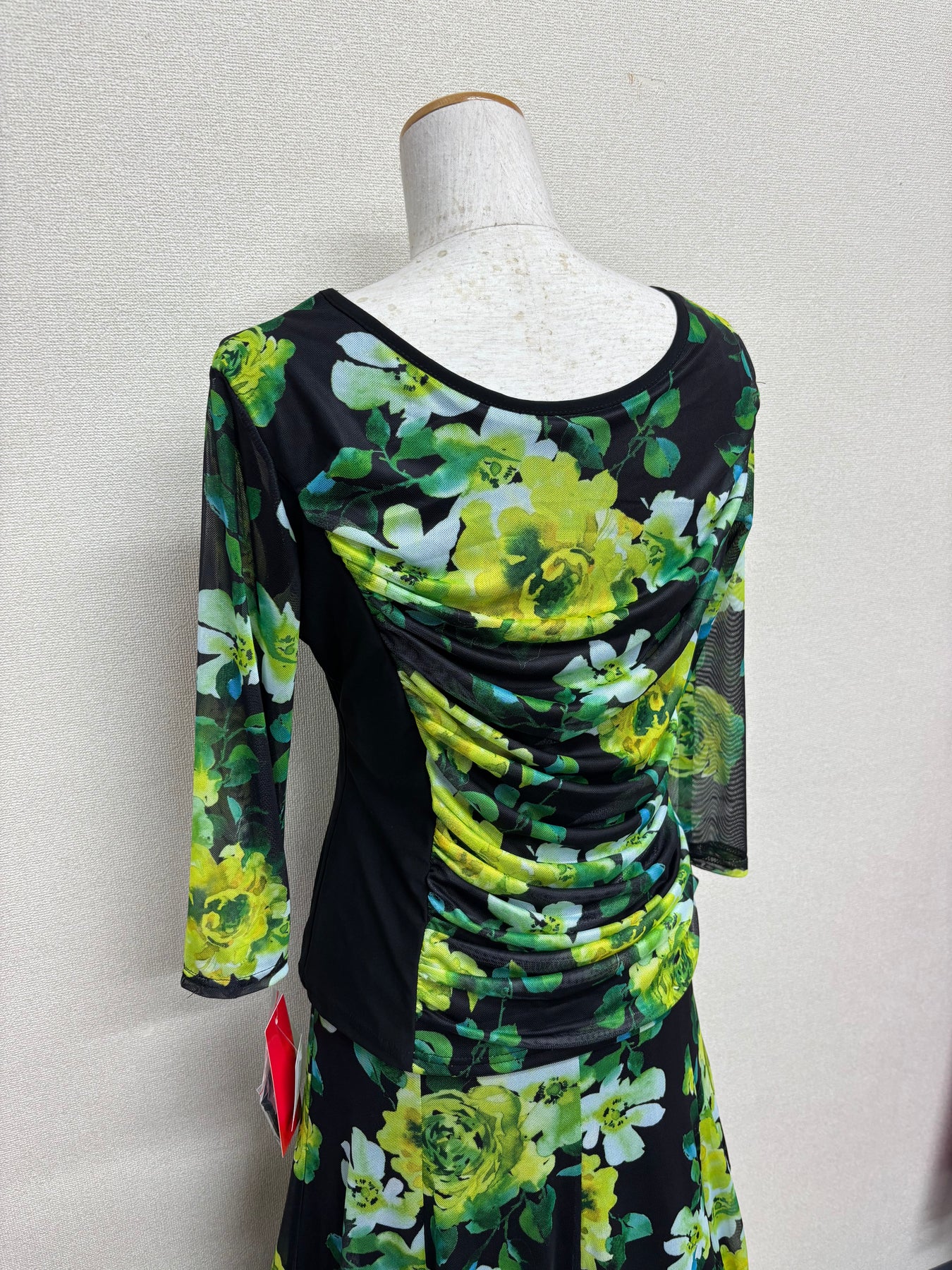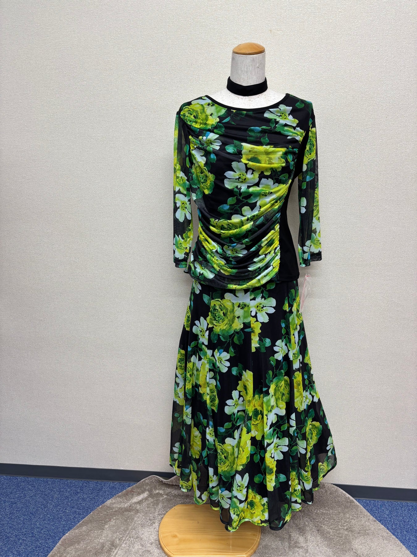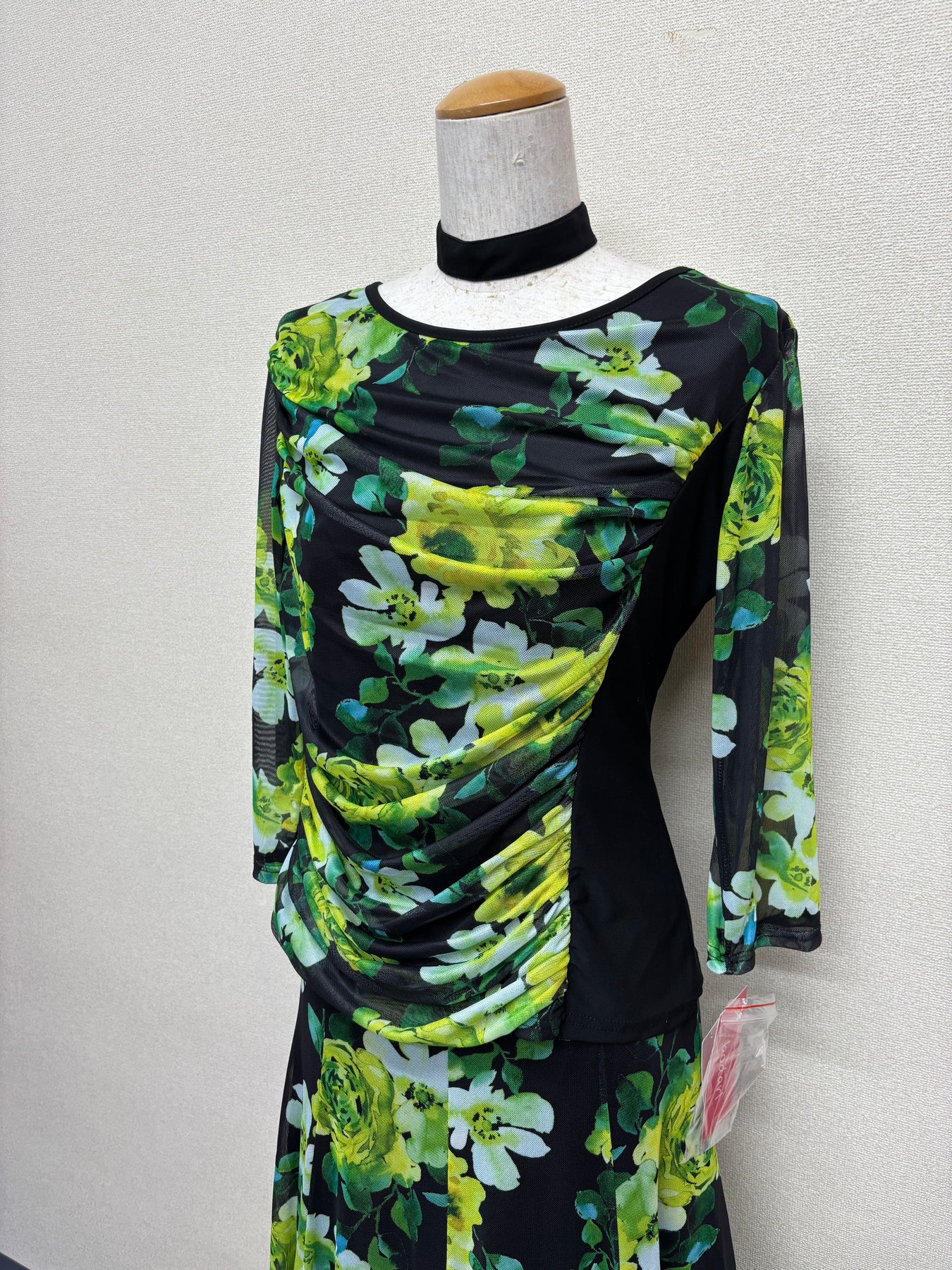 ビビットな花柄が目を引きます。トップスの左側が黒の無地で切り替えてあるので、ボディラインがすっきり見えます。スカートの裾にはオーガンジーのフリルが入っているので良く動きます。お教室のパーティーなどでも大活躍しそうなセットアップです。