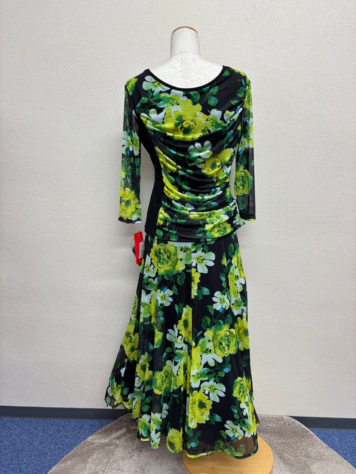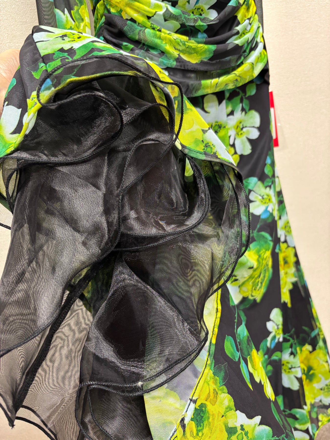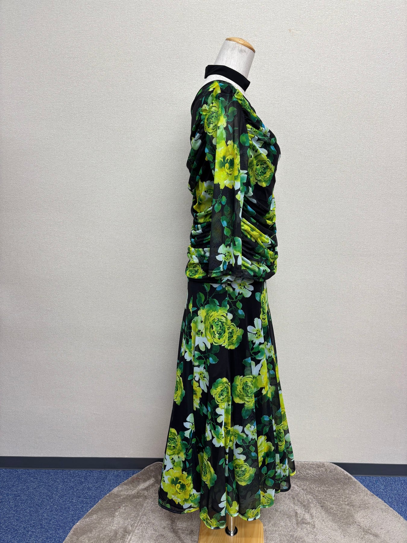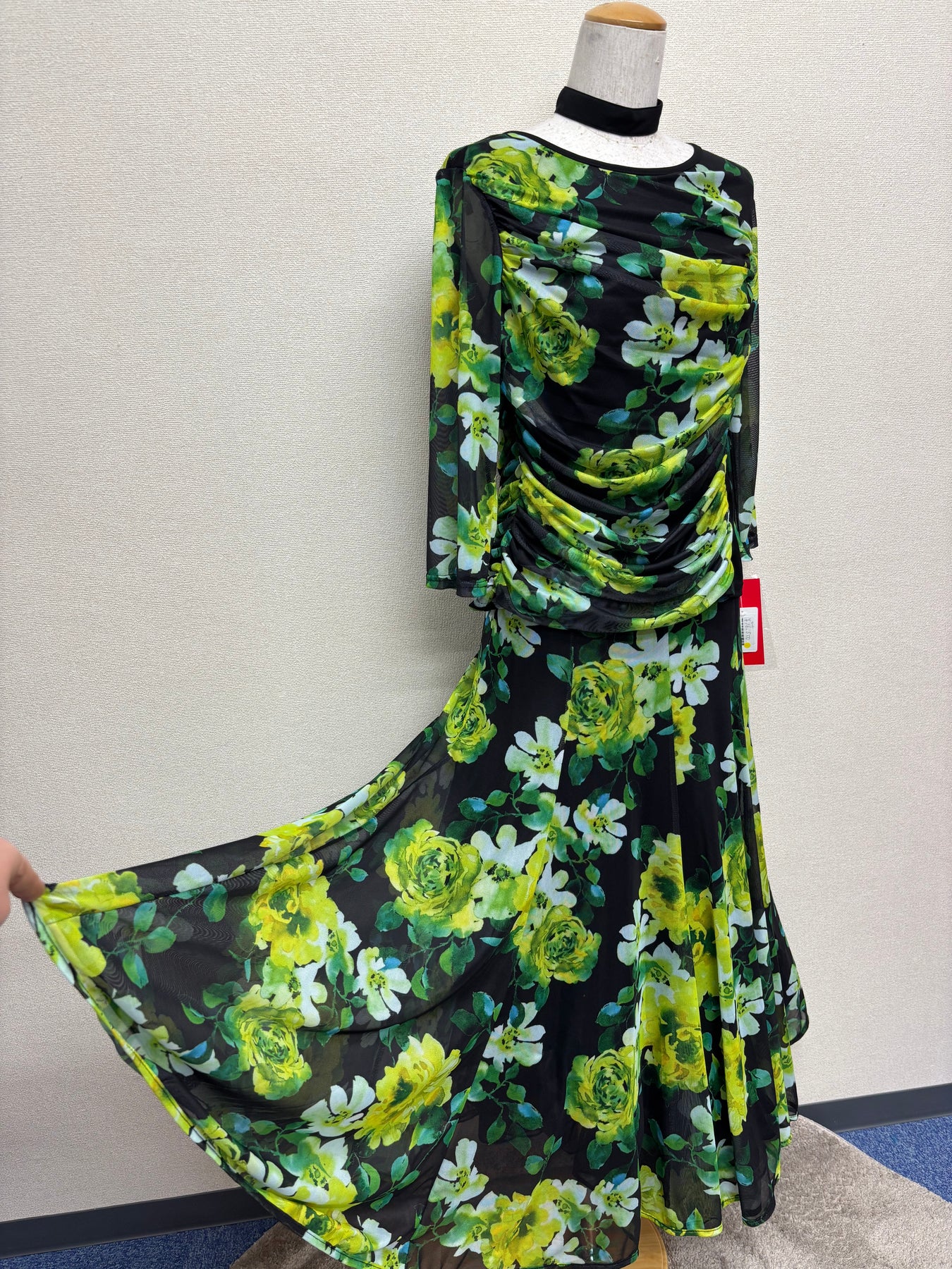ビビットな花柄が目を引きます。トップスの左側が黒の無地で切り替えてあるので、ボディラインがすっきり見えます。スカートの裾にはオーガンジーのフリルが入っているので良く動きます。お教室のパーティーなどでも大活躍しそうなセットアップです。